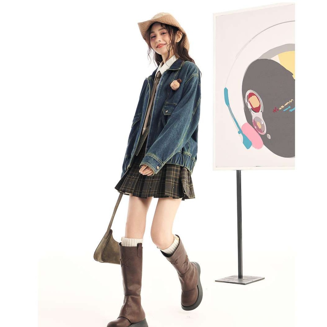 プリーツスカートとデニムジャケットの組み合わせで、可愛らしさと遊び心のあるスタイルを演出