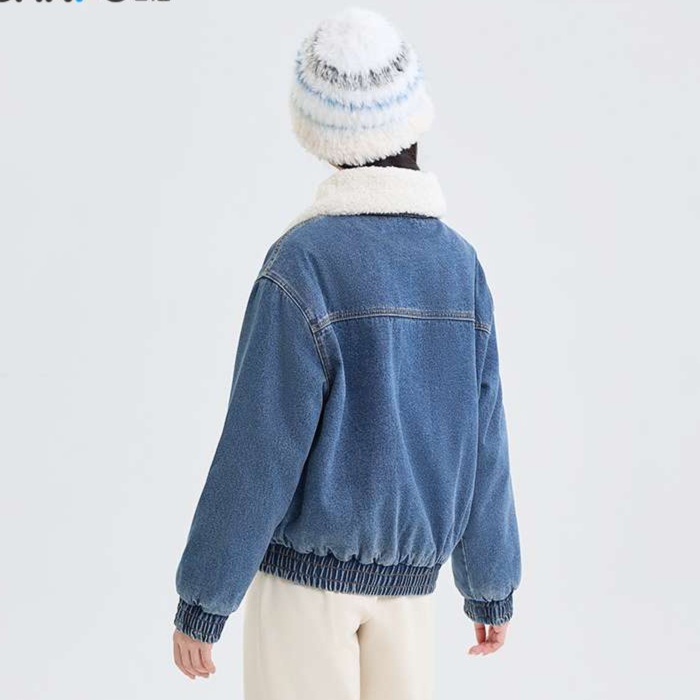 デニムジャケットの襟元に施されたボアがあたたかみのある冬らしい印象を演出