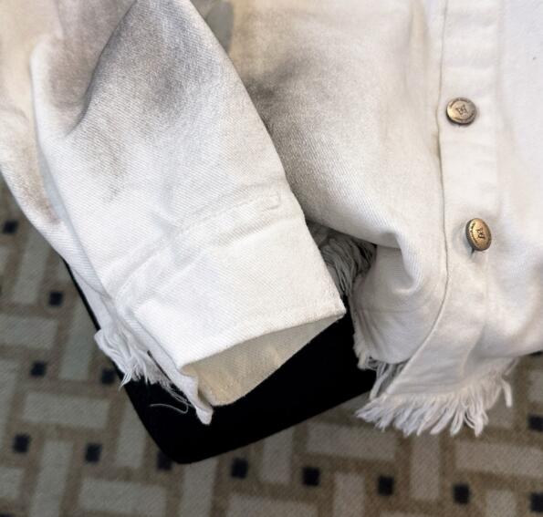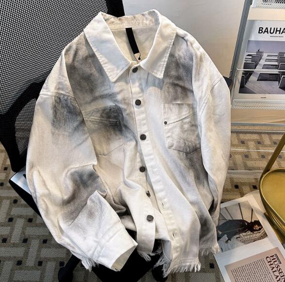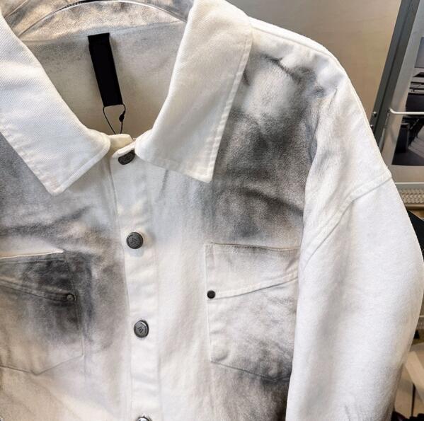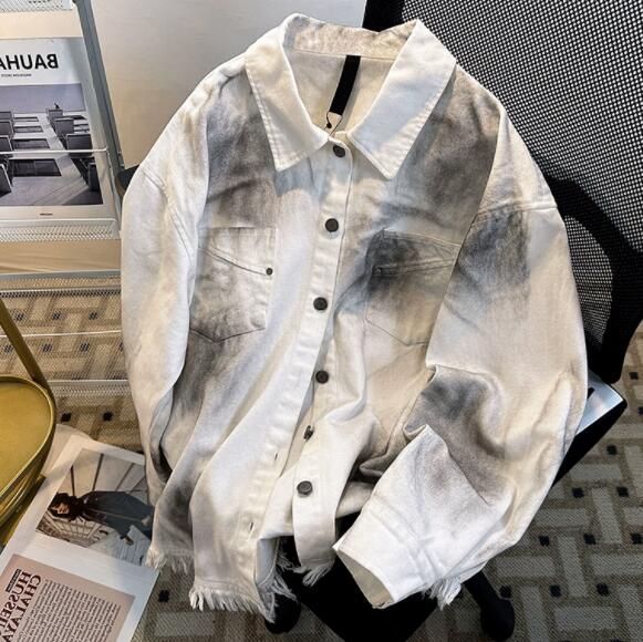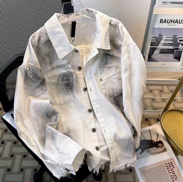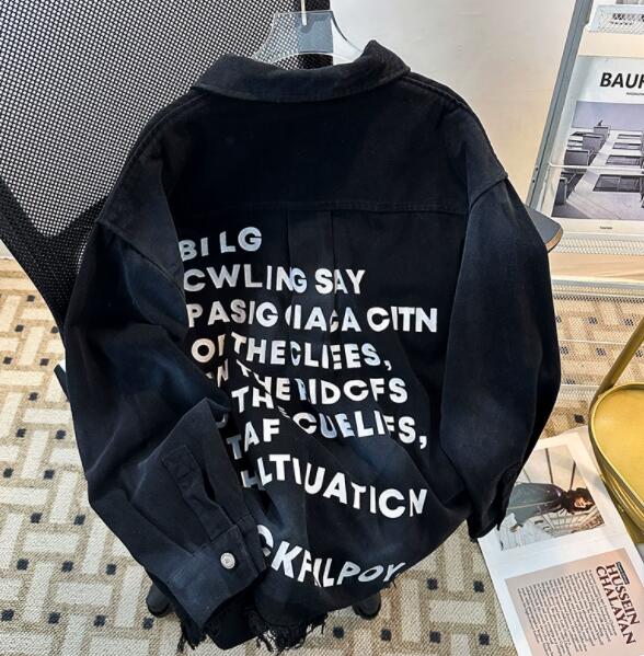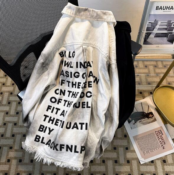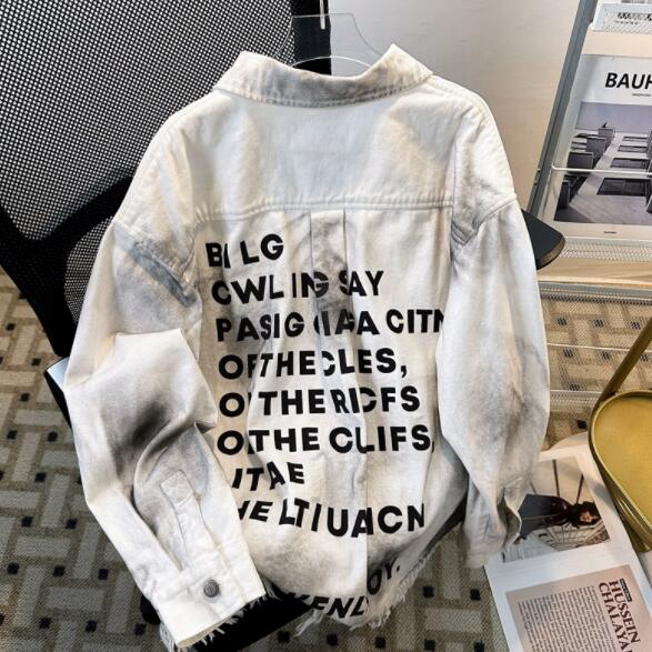 個性的な文字プリントが印象的なダメージ加工デニムジャケット。